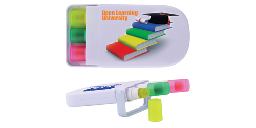 White case with three mini wax highlight markers. Converts to a desk stand. Superior shelf life to traditional highlight markers - leave the lid off and they still work. Highlight marker colours Yellow, Green, Pink with matching cap and white barrel.