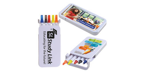 White case with set of two highlight markers (Orange, Yellow) and three half size ballpoint pens (Black, Red, Blue). Converts to a desk stand. Pen and highlighter barrels are white.