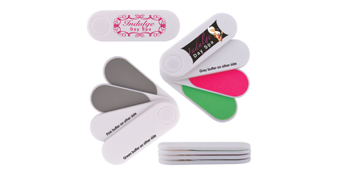 4 bladed fan nail file with 2 file pads and 2 buffer pads. Shapes and smooths nails and fits neatly into your purse or pocket.