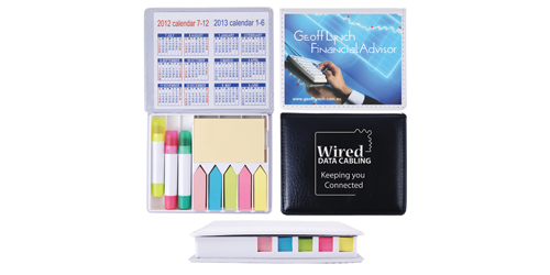 Vinyl desk caddy with flip lid. Contains 5 sets of adhesive coloured noteflags, 1 x adhesive note pad (44mmL x 72mmH) and 3 wax highlight markers in yellow, pink and green with white case.