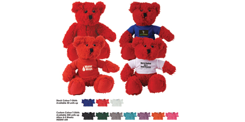 17cmH red plush sitting teddy bear with optional printed velcro polyester T-Shirt available in blue, red or white.