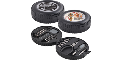24 piece tool kit in tyre shaped click lock case: 10 insert bits/adaptor set, universal handle, insert bit holder, 3 allen keys, 1 metre tape measure, 1 precision flat blade and 1 precision phillips head screwdriver, 5 to 9mm sockets, and pointy nose pliers.