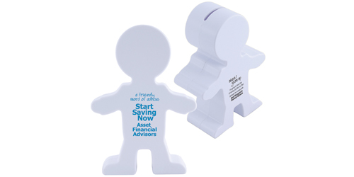 White man shaped coin bank with coin release at back.
