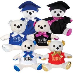 31cmH sitting calico signature / autograph bear with satin graduation gown (removable velcro opening) and mortar board (fixed). Graduation gown can be embroidered.