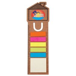House shaped 13cm/5inch cardboard bookmark ruler with 1 block of repositional notepads with 15 leaves (45mmL x 40mmH) and 5 adhesive noteflags with 15 leaves per colour (Orange, Pink, Yellow, Green, Blue).